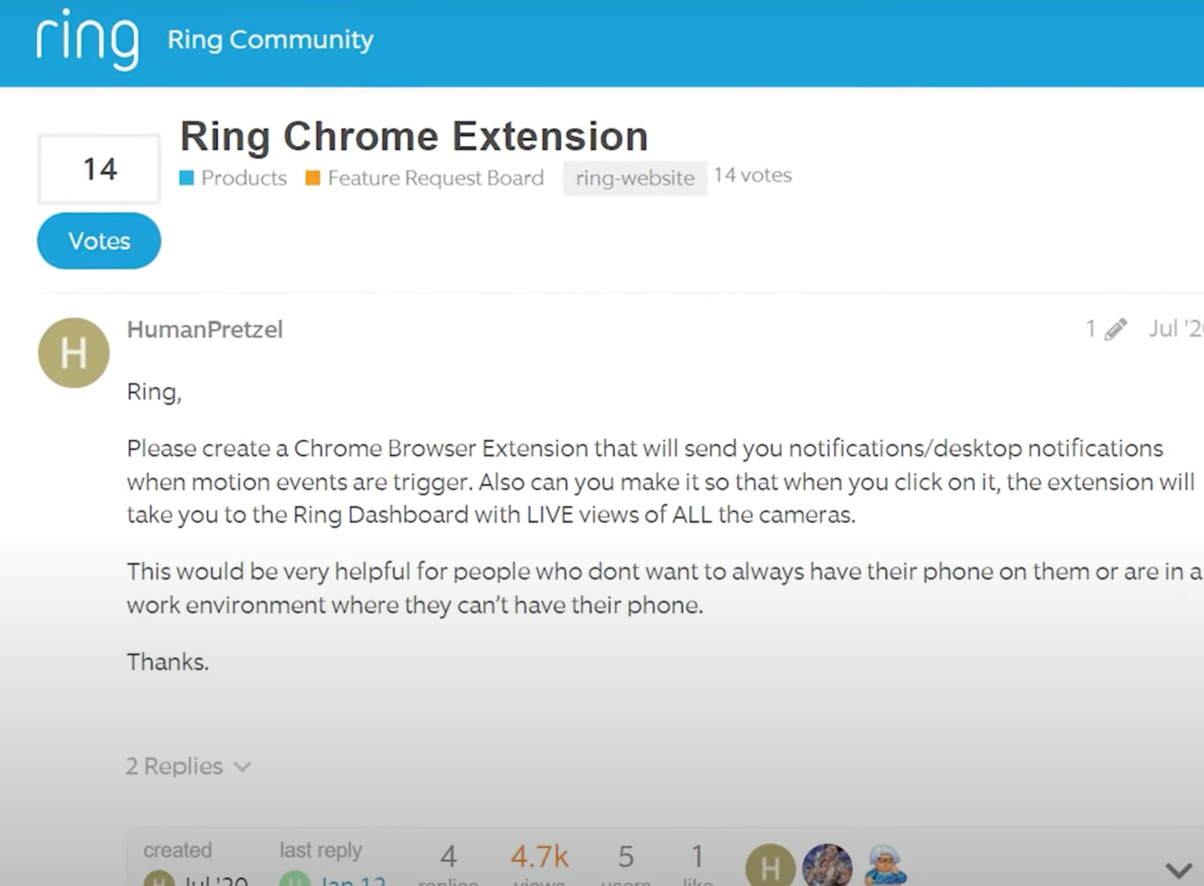 I came across a post on the Ring forums where users were actively begging for a Chrome extension to be developed. The post has over 4,000 views, which is a lot of potential customers.